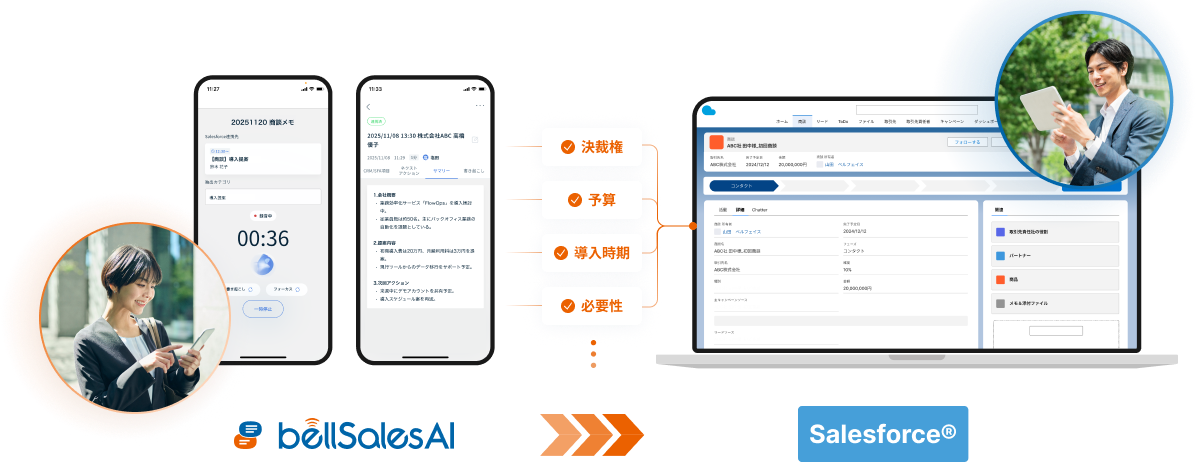 bellSalesAIの要約制度とSalesforce連携完了までのシームレスなUXを評価し導入に至りました。営業担当者がSalesforce入力に費やしていた時間を大幅に削減でき、その分を顧客対応や提案準備に充てることができるようになりました。特に、商談内容が自動的に構造化され、上長への報告も効率化されたことで、営業組織全体の生産性が向上しています。操作も直感的で現場への定着もスムーズでした。