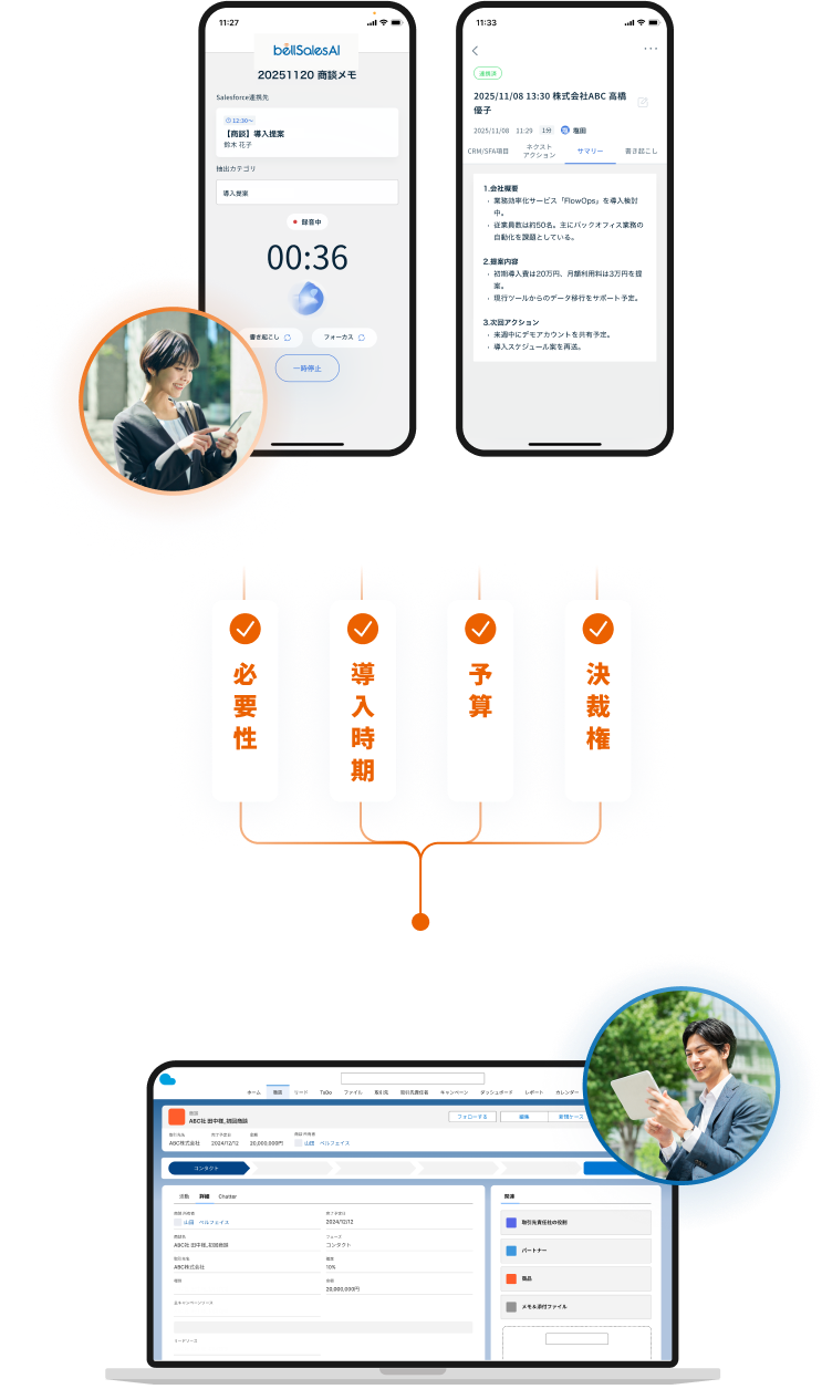 bellSalesAIは、最高効率を目指す営業組織のためのプロダクトです。ボタン1つでSalesforce連携。商談終了後すぐに情報共有が可能です。商談のサマリーやネクストアクションもSlackやTeamsに自動通知。データの質と量が改善することでSFAによるマネジメントやデータ分析が可能になり、営業が次にやるべきことがわかります。