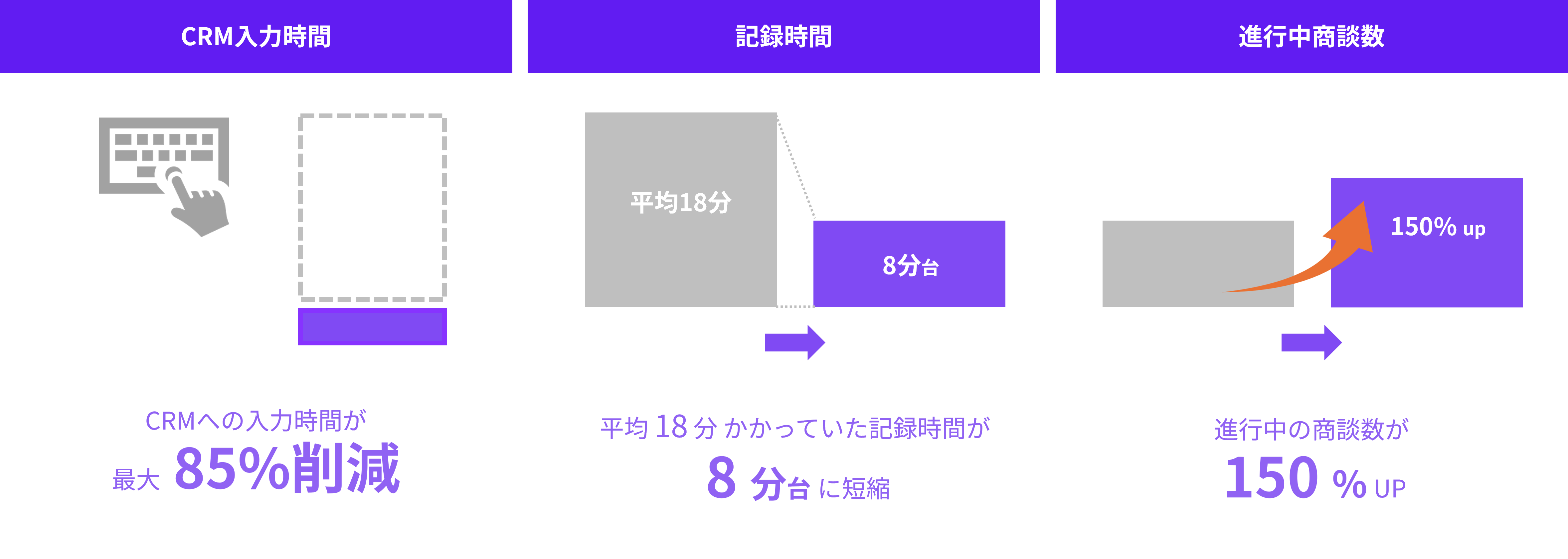 記録時間が18分から8分台へ短縮されたことで、1日あたり約10分×商談数分の余白が生まれ、営業活動へ再投資できる時間が確保されました。